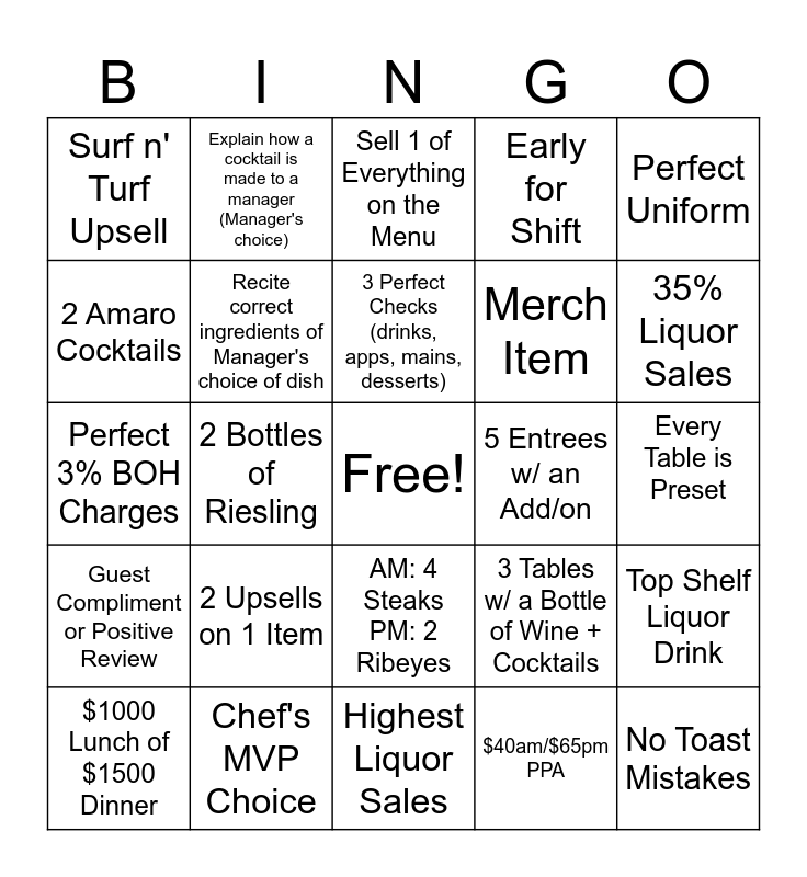 This bingo card has a free space and 24 words: 2 Upsells on 1 Item, Chef's MVP Choice, 3 Perfect Checks (drinks, apps, mains, desserts), $1000 Lunch of $1500 Dinner, Perfect Uniform, Surf n' Turf Upsell, 2 Amaro Cocktails, Explain how a cocktail is made to a manager (Manager's choice), 5 Entrees w/ an Add/on, AM: 4 Steaks PM: 2 Ribeyes, Merch Item, Perfect 3% BOH Charges, 3 Tables w/ a Bottle of Wine + Cocktails, Top Shelf Liquor Drink, Recite correct ingredients of Manager's choice of dish, $40am/$65pm PPA, Every Table is Preset, Sell 1 of Everything on the Menu, 35% Liquor Sales, 2 Bottles of Riesling, No Toast Mistakes, Guest Compliment or Positive Review, Early for Shift and Highest Liquor Sales.