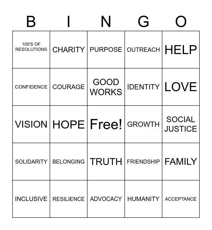 This bingo card has a free space and 52 words: FAITH, ACCEPTANCE, ACTION, ADVOCACY, BELONGING, CHANGE, CHARITY, COMPASSION, CONFIDENCE, CONNECTION, COURAGE, DIVERSITY, FAMILY, FRIENDSHIP, FULFILLMENT, FUTURE, GOOD WORKS, GROWTH, HEALING, HELP, HOPE, HUMANITY, 100'S OF RESOLUTIONS, IDENTITY, INNOVATION, INSPIRE, INTEGRITY, LEADERS, LOVE, MEANING, MENTORSHIP, OUTREACH, PEACE, POWER, PRIDE, PURPOSE, RESILIENCE, RESPECT, SERVICE, SISTERHOOD, SISTERS, SOCIAL JUSTICE, SOLIDARITY, STRENGTH, TRUTH, UNITY, VALUES, VISION, VOICE, WELCOME, INCLUSIVE and SPIRITUALITY.