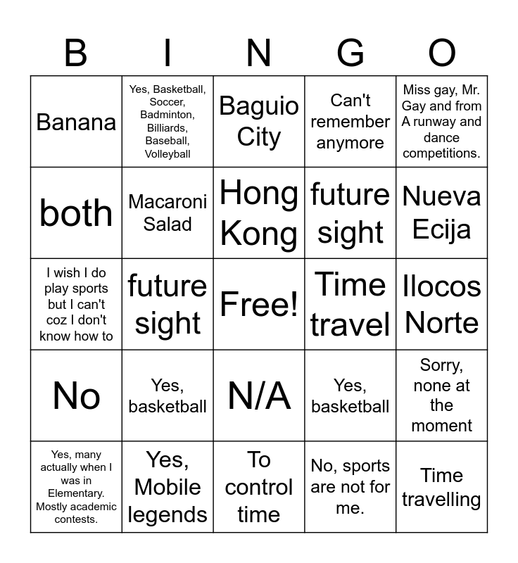 This bingo card has a free space and 56 words: Can't remember anymore, Yes, many actually when I was in Elementary. Mostly academic contests., Super rich, Banana, To control time, Can't remember anymore, Macaroni Salad, Hong Kong, future sight, No, Can't remember anymore, Bayawan City Negros Oriental Philippines, So far CEBU!!!, Basketball, Someone ate the chicken I already ate while drinking, spaghetti, chicken feet, Miss gay, Mr. Gay and from A runway and dance competitions., future sight, Guimaras Island, Time travelling, Time travel, Atok, Benguet, Yes, basketball, Baguio City, My fiance, Nihilism, and stoicism, Hong Kong, Jesus, Investment and savings, Nueva Ecija, Yes, I have a cat. I named him Tyrion., Ang ganda mo today, Sumakay sa jeep na hindi nagbabayad, Yes, Mobile legends, Someone ate the chicken I already ate while drinking, Ilocos Norte, both, I wish I do play sports but I can't coz I don't know how to, I don't play sports, sorry TwT, No, Yes, Basketball, Soccer, Badminton, Billiards, Baseball, Volleyball, N/A, Basketball, I'm not that athletic type of a guy but if i do that will be baseball., no, no, Yes, basketball, Yes, Mobile legends, Basketball, No, No, No, sports are not for me., No, Badminton, Football, Swimming, Badminton, Volleyball, Sorry, none at the moment and yes, badminton.