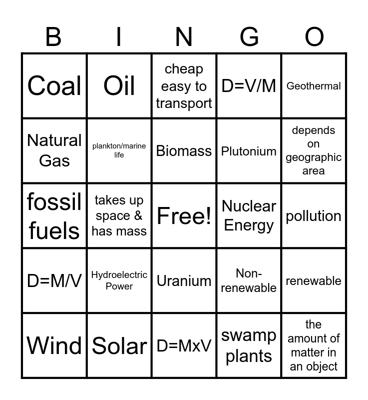 This bingo card has a free space and 24 words: Hydroelectric Power, Solar, Biomass, Wind, Geothermal, Coal, Natural Gas, Oil, Nuclear Energy, Uranium, Plutonium, fossil fuels, Non-renewable, renewable, plankton/marine life, swamp plants, pollution, cheap easy to transport, depends on geographic area, takes up space & has mass, the amount of matter in an object, D=M/V, D=V/M and D=MxV.