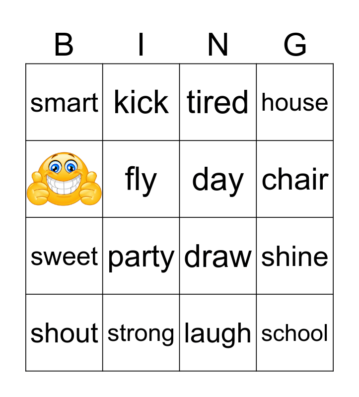 This bingo card has 1 images and 15 words: strong, shine, tired, smart, sweet, kick, draw, laugh, fly, shout, house, party, chair, day and school.