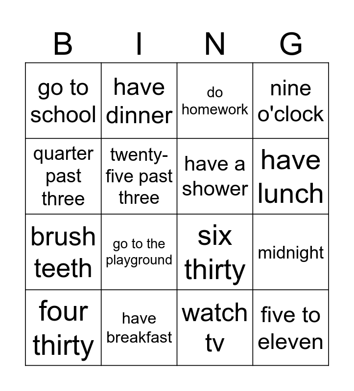 This bingo card has 24 words: wake up, seven o'clock, have lunch, get home from school, quarter past three, go to school, twenty-five past three, have dinner, have breakfast, midday, brush teeth, six thirty, quarter to four, go to bed, have a shower, play with friends, watch tv, do homework, go to the playground, midnight, four thirty, five to eleven, nine o'clock and watch tv.
