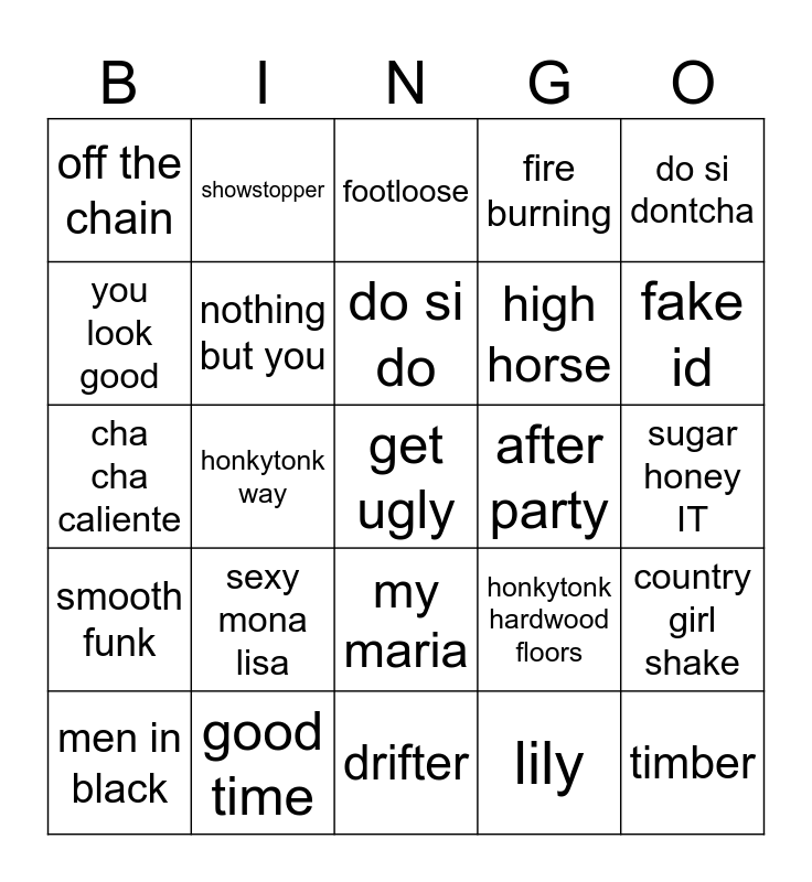 This bingo card has 109 words: 3 to tango, aces and eights, after party, aint too cool, american kids, asking questions, back it up, bambalam, big energy, bikini on top, blown away, boomerang, Free!, booze cruise, boys, burn it to the ground, cha cha caliente, cherry bottom boom, church clap, countdown, country girl shake, country girl stomp, cowboy hip hop, cupid shuffle, devil made me do it, do si do, do si dontcha, double d, drunk and i dont wanna go home, exs and ohs, fake id, fire burning, footloose, four on the floor, fet it, get ugly, shivers, goin hamm, good time, groovy love, half past tipsy, high class, high horse, honkytonk way, honkytonk hardwood floors, house party, I love country music, Fabulous, in the six, jumanji, jump, keep it simple, lily, late night habits, lil bit, lonely drum, make it shake, more dessert, new thang, nothing but you, off the chain, outlaw, play that sax, raised like that, rampampam, redneck angel, rodeo, rude dude, say hey, shape of you, shes a natural, showstopper, smooth funk, sounds like something id do, stitches, stuck like glue, sugar honey IT, sunroof, tgif, the bounce, the fighter, the vibe, the walk, the wolf, timber, turn me loose, we are tonight, west coast passion, you look good, infectious, cooler than me, sexy mona lisa, take it off, boot scoot boogie, copperhead road, dizzy, cowboy cha cha, desperado rap, drifter, el paso, queens waltz, texas time, men in black, my maria, swamp thing, tush push, walk the line, watermelon crawl and beer money.