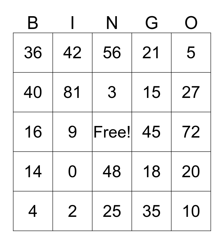 This bingo card has a free space and 24 words: 0, 2, 3, 4, 5, 36, 40, 42, 45, 48, 15, 16, 18, 20, 81, 35, 72, 56, 27, 9, 10, 14, 21 and 25.
