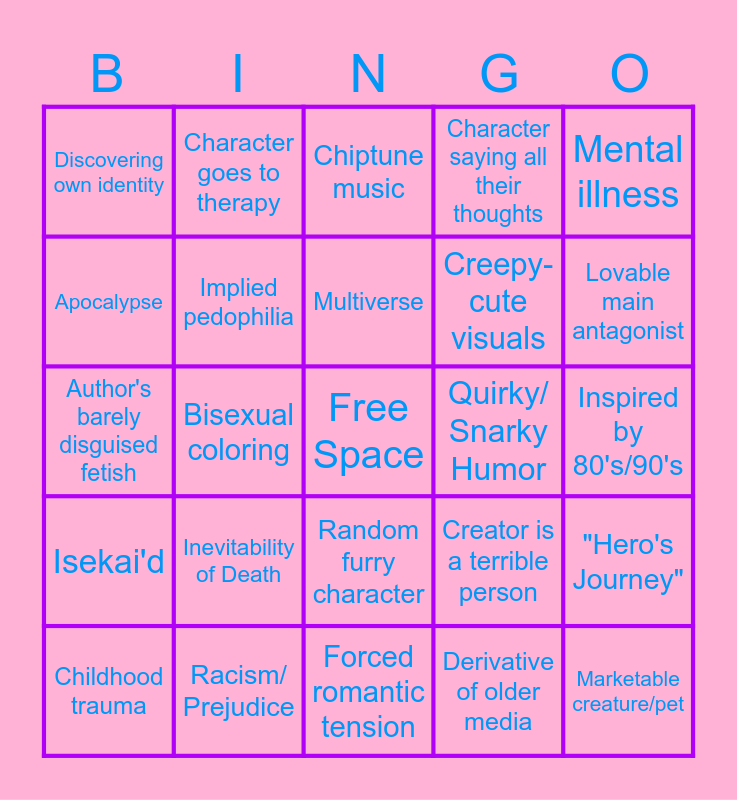This bingo card has a free space and 24 words: Inevitability of Death, Racism/ Prejudice, Multiverse, Childhood trauma, Mental illness, Discovering own identity, Apocalypse, Character goes to therapy, Quirky/ Snarky Humor, Random furry character, Creepy-cute visuals, Author's barely disguised fetish, Creator is a terrible person, "Hero's Journey", Implied pedophilia, Derivative of older media, Inspired by 80's/90's, Chiptune music, Lovable main antagonist, Bisexual coloring, Marketable creature/pet, Isekai'd, Character saying all their thoughts and Forced romantic tension.