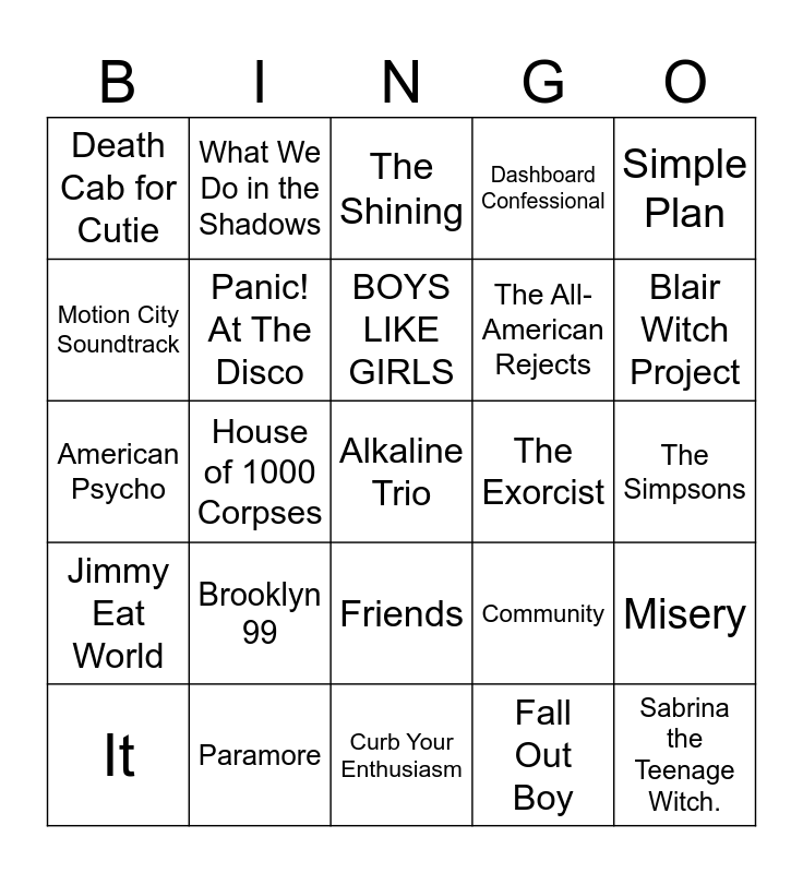 This bingo card has 60 words: My Chemical Romance, Paramore, Taking Back Sunday, Jimmy Eat World, Fall Out Boy, The Used, Panic! At The Disco, blink-182, The All-American Rejects, Taking Back Sunday, Dashboard Confessional, The Get Up Kids, Motion City Soundtrack, Good Charlotte, Modest Mouse, Death Cab for Cutie, Alkaline Trio, Simple Plan, Coheed and Cambria, BOYS LIKE GIRLS, The Exorcist, The Shining, It, Misery, The Birds, Psycho, Poltergeist, The Sixth Sense, Blair Witch Project, Pet Sematary, The Human Centipede, The Hills Have Eyes, Saw, Rosemary’s Baby, What We Do in the Shadows, Get Out, Jaws, House of 1000 Corpses, 13 Ghosts, American Psycho, The Office, Brooklyn 99, The Simpsons, Boy Meets World, Community, Bob’s Burgers, Bojack Horseman, Freaks and Geeks, Parks and Recreation, Friends, Curb Your Enthusiasm, New Girl, It’s Always Sunny in Philadelphia, Stranger Things, Glee, Buffy the Vampire Slayer, How I Met Your Mother, 30 Rock, Sabrina the Teenage Witch. and Supernatural.