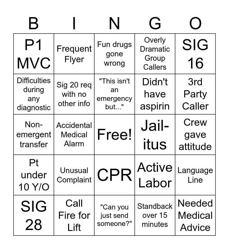 This bingo card has a free space and 24 words: Unusual Complaint, Call Fire for Lift, "This isn't an emergency but...", SIG 28, SIG 16, P1 MVC, Difficulties during any diagnostic, Frequent Flyer, Jail-itus, CPR, Didn't have aspirin, Non-emergent transfer, Active Labor, Language Line, Sig 20 req with no other info, Standback over 15 minutes, Crew gave attitude, Fun drugs gone wrong, 3rd Party Caller, Accidental Medical Alarm, Needed Medical Advice, Pt under 10 Y/O, Overly Dramatic Group Callers and "Can you just send someone?".