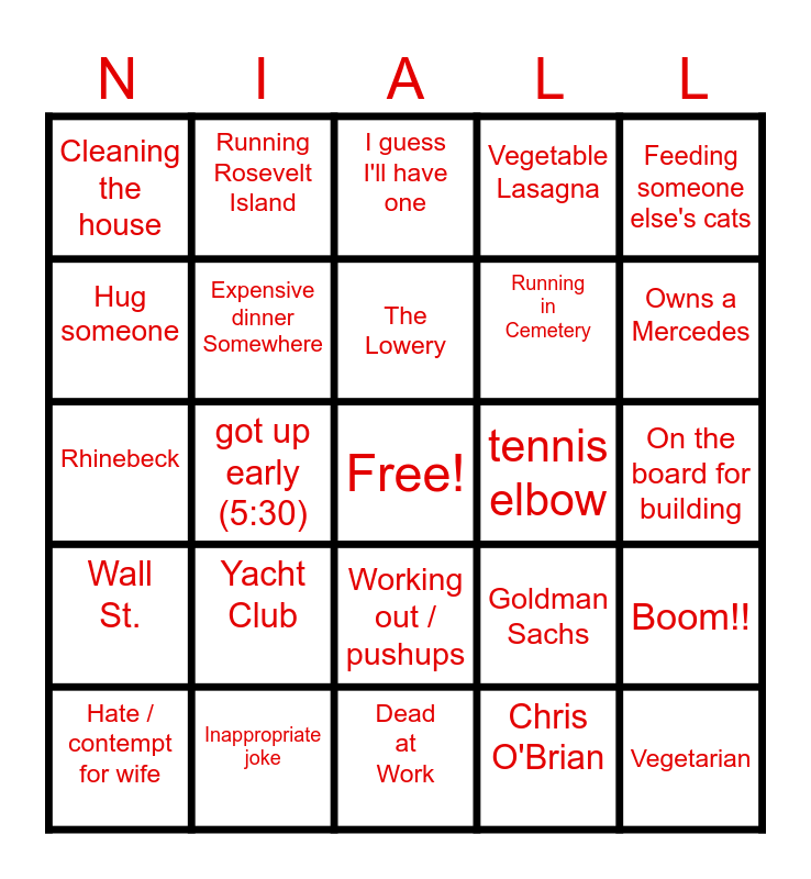 This bingo card has a free space and 28 words: Boom!!, Kids / wife lunch, Running in Cemetery, Chris O'Brian, Hug someone, I guess I'll have one, Running Rosevelt Island, Wall St., tennis elbow, Hate / contempt for wife, Rhinebeck, Vegetable Lasagna, Inappropriate joke, Dead at Work, Owns a Mercedes, Binghamton / kid college, Yacht Club, Expensive dinner Somewhere, The Lowery, Working out / pushups, Cleaning the house, Mentions his cats, Vegetarian, got up early (5:30), On the board for building, Goldman Sachs, Feeding someone else's cats and Someone else drinks a lot / too much.