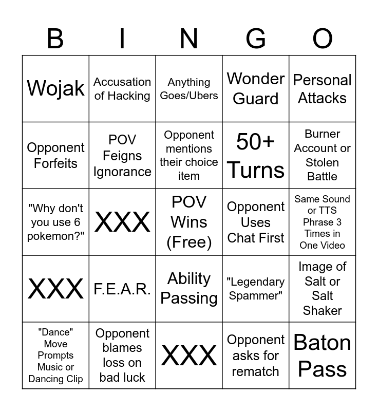 This bingo card has a free space and 24 words: F.E.A.R., Opponent blames loss on bad luck, Opponent mentions their choice item, "Dance" Move Prompts Music or Dancing Clip, Personal Attacks, Wojak, Opponent Forfeits, Accusation of Hacking, Opponent Uses Chat First, Ability Passing, 50+ Turns, "Why don't you use 6 pokemon?", "Legendary Spammer", Image of Salt or Salt Shaker, POV Feigns Ignorance, Opponent asks for rematch, Same Sound or TTS Phrase 3 Times in One Video, Anything Goes/Ubers, Burner Account or Stolen Battle, XXX, Baton Pass, XXX, Wonder Guard and XXX.