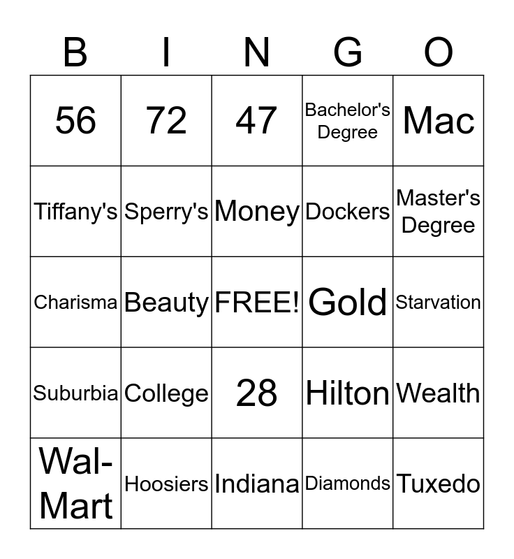 This bingo card has a free space and 99 words: 2, 17, 33, 47, 71, 4, 22, 41, 49, 63, 10, 24, 3, 28, 44, 56, 72, 6, 30, 45, 59, 75, 51, 65, Rich, Wealth, Money, Cash, Income, Bloomington, Indiana, Diamonds, Jewelry, Glamor, Beauty, Charisma, Charm, Affluent, Prosperous, College, MBA, Master's Degree, Bachelor's Degree, Hoosiers, Lake Monroe, Yacht, Kirkwood, McNutt, Frat Castle, Little 5, Capital, Tuxedo, Hilton, JW Marriott, Yankees, Bling, Cadillac, Formula One, Oakley's, Hollywood, Picket Fence, Disneyland, Mustang, BMW, Mercedes, Mac, iPad, Smartphone, Golf, Suburbia, Fiscal Cliff, Dockers, Tiffany's, Victoria's Secret, Uggs, Coach, Sperry's, Pink, H'orderves, iPhone, Gold, Ruth Criss, Charlotte Russe, Big Screen TV, Poverty, Fiscal Cliff, College Debt, FAFSA, Starvation, Wal-Mart, Minivan, Minimum Wage, Goodwill, Kroghetto, Food Stamps, Welfare, Drug Use, Alcohol Abuse and GED.