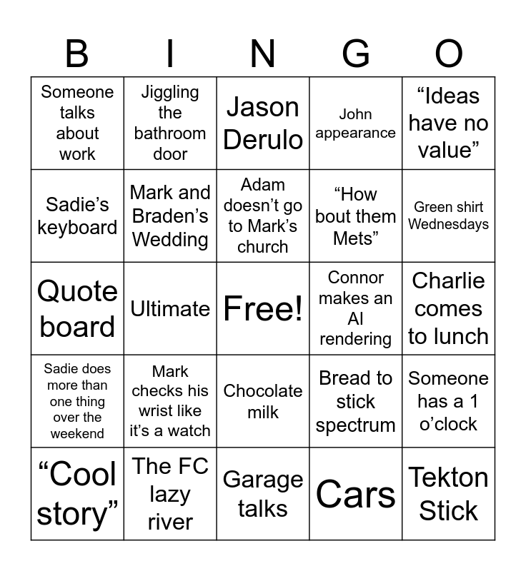 This bingo card has a free space and 29 words: “Cool story”, REI, Ultimate, Professor Kopenkoskey, Someone talks about work, Jason Derulo, Mark and Braden’s Wedding, Mark checks his wrist like it’s a watch, Connor makes an AI rendering, The FC lazy river, Charlie comes to lunch, Tekton Stick, Garage talks, Cars, Green shirt Wednesdays, Fig bars, Chocolate milk, Sadie does more than one thing over the weekend, “Ideas have no value”, Quote board, Bread to stick spectrum, Hallways, “How bout them Mets”, Sadie’s keyboard, John appearance, Jiggling the bathroom door, Someone has a 1 o’clock, Adam doesn’t go to Mark’s church and “Jenna…”.