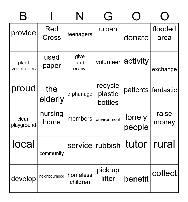 This bingo card has 36 words: rubbish, service, pick up litter, plant vegetables, clean playground, recycle plastic bottles, used paper, homeless children, donate, tutor, exchange, urban, rural, the elderly, volunteer, provide, local, patients, proud, teenagers, orphanage, nursing home, environment, members, lonely people, Red Cross, activity, neighbourhood, give and receive, flooded area, collect, develop, raise money, fantastic, community and benefit.
