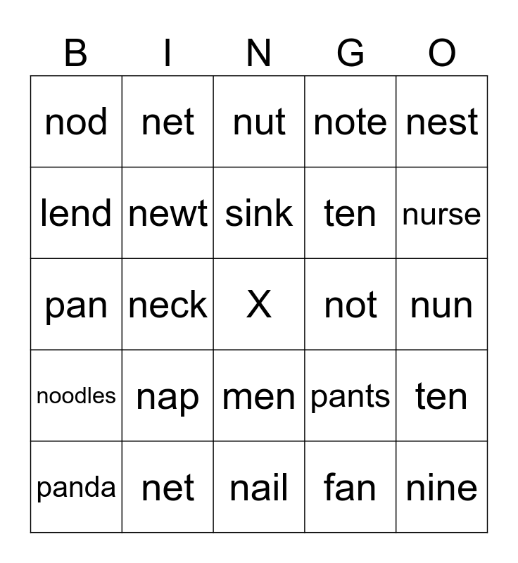 This bingo card has a free space and 24 words: nap, net, sink, panda, nest, nod, lend, net, not, men, ten, pan, pants, ten, newt, fan, nun, nut, nurse, neck, nine, noodles, note and nail.