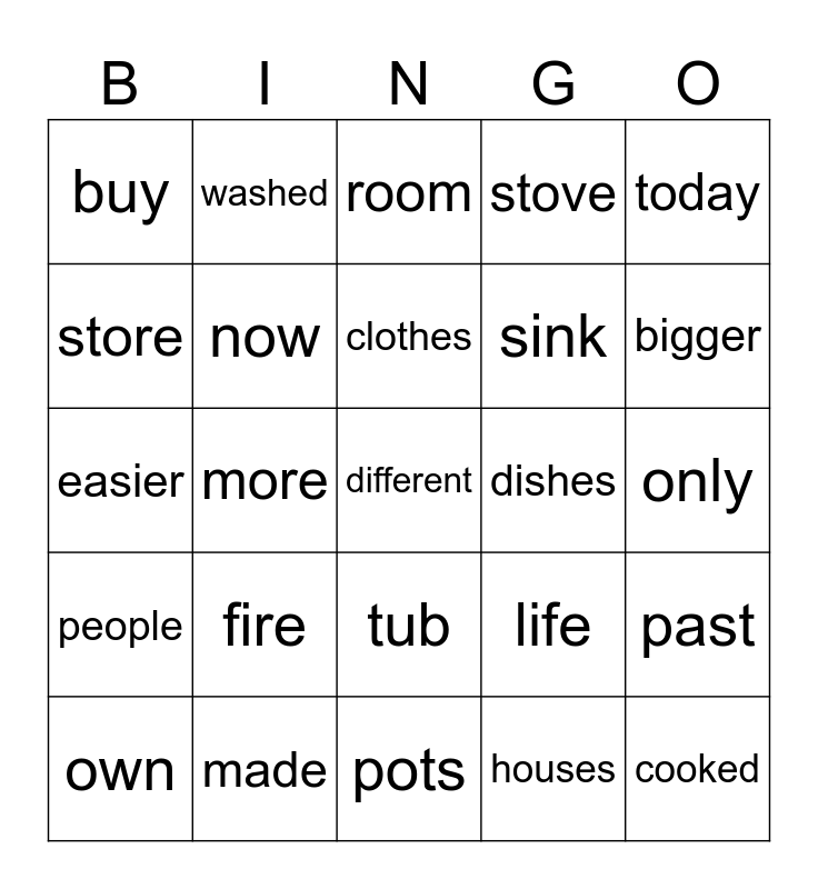 This bingo card has a free space and 24 words: fire, made, clothes, own, today, buy, store, washed, dishes, tub, sink, easier, life, past, now, houses, only, room, bigger, more, cooked, people, stove and pots.