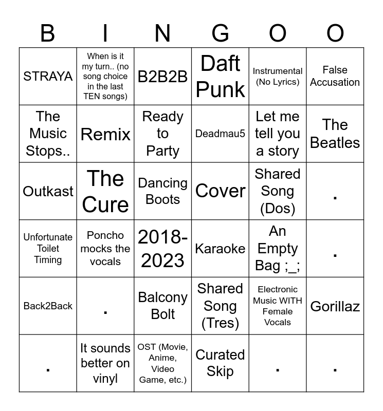 This bingo card has 36 words: Shared Song (Tres), Balcony Bolt, Curated Skip, The Music Stops.., Unfortunate Toilet Timing, Cover, Remix, OST (Movie, Anime, Video Game, etc.), Instrumental (No Lyrics), Electronic Music WITH Female Vocals, The Beatles, Daft Punk, Gorillaz, The Cure, Deadmau5, STRAYA, Back2Back, Shared Song (Dos), Outkast, B2B2B, Dancing Boots, Poncho mocks the vocals, Karaoke, 2018-2023, An Empty Bag ;_;, When is it my turn.. (no song choice in the last TEN songs), Let me tell you a story, It sounds better on vinyl, Ready to Party, False Accusation, ., ., ., ., . and ..