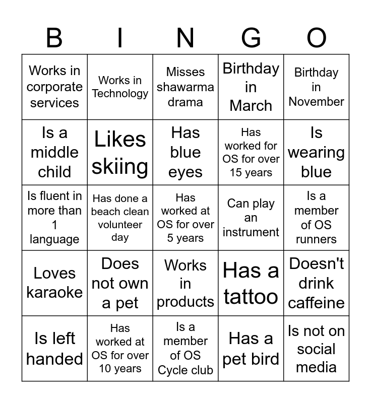This bingo card has a free space and 24 words: Does not own a pet, Has worked at OS for over 10 years, Has blue eyes, Is left handed, Birthday in November, Works in corporate services, Is a middle child, Works in Technology, Can play an instrument, Works in products, Has worked for OS for over 15 years, Is fluent in more than 1 language, Has a tattoo, Doesn't drink caffeine, Likes skiing, Has a pet bird, Is a member of OS runners, Misses shawarma drama, Is wearing blue, Has done a beach clean volunteer day, Is not on social media, Loves karaoke, Birthday in March and Is a member of OS Cycle club.