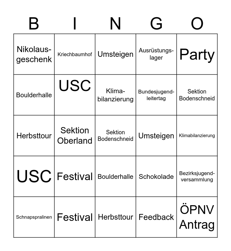 This bingo card has 50 words: ÖPNV Antrag, Sektion Bodenschneid, Nikolaus Kostüm Dieb, Herbsttour, Festival, Maßnahmen- förderung, Kriechbaumhof, Canyoning, Boulderhalle, Schnapspralinen, USC, Ausrüstungs- lager, Bezirksjugend- versammlung, Schokolade, Kochteam, Weihnachten, Klima- bilanzierung, Umsteigen, Essen, Party, Sektion Oberland, Feedback, Nikolaus- geschenk, Bundesjugend-leitertag, Sektion München, ÖPNV Antrag, Sektion Bodenschneid, Nikolaus Kostüm Dieb, Umsteigen, Boulderhalle, Feedback, Essen, Kochteam, Canyoning, Festival, Ausrüstungslager, Bezirksjugendversammlung, Sektion München, Maßnahmenförderung, Klimabilanzierung, Kriechbaumhof, Schokolade, Nikolausgeschenk, Bundesjugendleitertag, Schnapspralinen, Herbsttour, Party, Weihnachten, USC and Sektion Oberland.