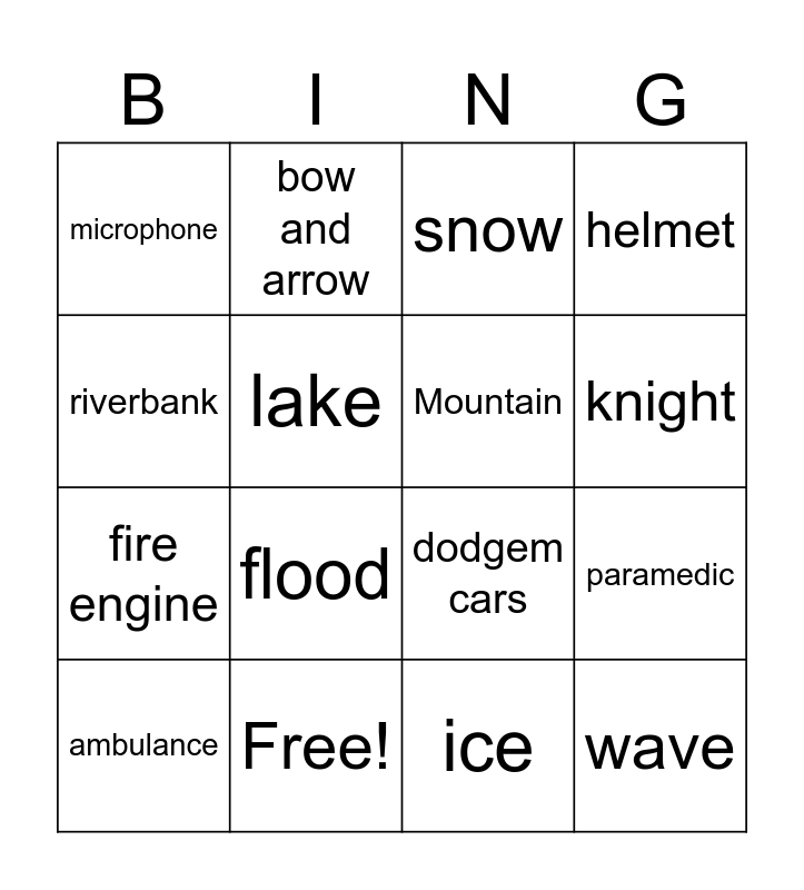 This bingo card has 30 words: fire, roundabout, paramedic, island, microphone, snow, Mountain, village, Free!, journalist, ice, ambulance, photographer, firefighter, flood, shield, emergency services, wave, tsunami, riverbank, dodgem cars, forest, bow and arrow, fire engine, lake, helmet, bracelet, sword, knight and belt.