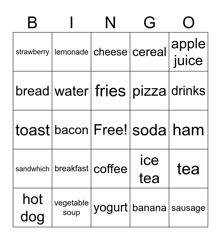 This bingo card has a free space and 24 words: breakfast, vegetable soup, fries, hot dog, apple juice, strawberry, bread, lemonade, soda, coffee, pizza, toast, ice tea, tea, water, banana, ham, cheese, drinks, bacon, sausage, sandwhich, cereal and yogurt.