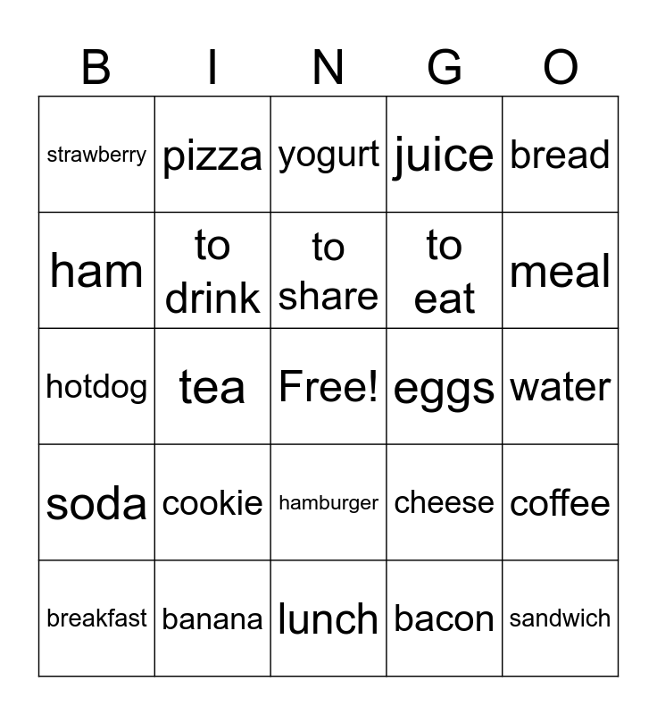 This bingo card has a free space and 24 words: cookie, banana, to share, breakfast, bread, strawberry, ham, pizza, eggs, hamburger, to eat, hotdog, cheese, coffee, to drink, bacon, water, yogurt, meal, tea, sandwich, soda, juice and lunch.