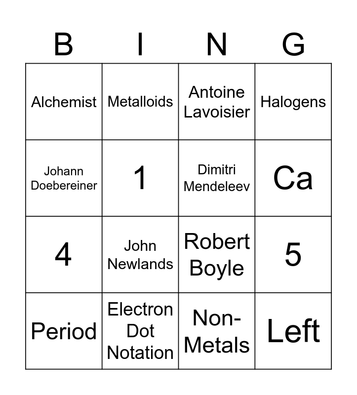 This bingo card has 21 words: Electron Dot Notation, Atomic #, Metalloids, Metals, Non-Metals, Dimitri Mendeleev, Alchemist, Antoine Lavoisier, Robert Boyle, Ca, 4, Halogens, Left, Alkali-earth Metal, 1, Column, Period, John Newlands, Johann Doebereiner, 5 and Noble Gases.
