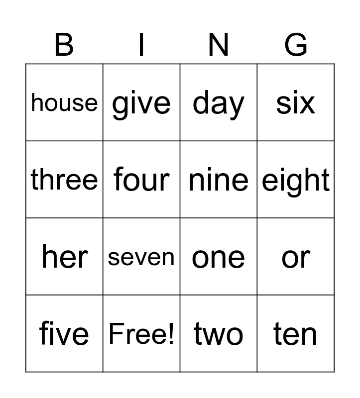 This bingo card has 16 words: Free!, or, day, house, her, give, one, two, three, four, five, six, seven, eight, nine and ten.