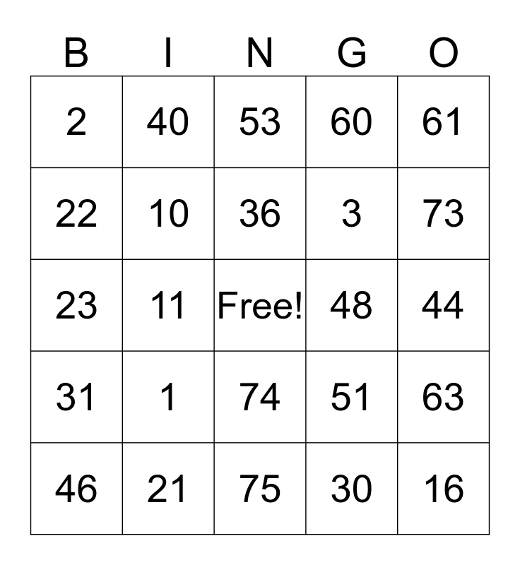 This bingo card has a free space and 24 words: 1, 21, 36, 46, 61, 2, 22, 40, 48, 74, 3, 23, 51, 63, 10, 30, 44, 53, 73, 11, 16, 31, 60 and 75.
