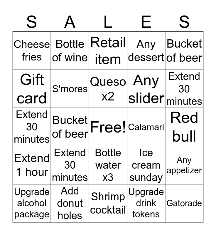 This bingo card has a free space and 24 words: Extend 30 minutes, Add donut holes, Queso x2, Upgrade alcohol package, Bucket of beer, Cheese fries, Gift card, Bottle of wine, Calamari, Bottle water x3, Any slider, Extend 30 minutes, Ice cream sunday, Any appetizer, S'mores, Upgrade drink tokens, Red bull, Retail item, Extend 30 minutes, Bucket of beer, Gatorade, Extend 1 hour, Any dessert and Shrimp cocktail.