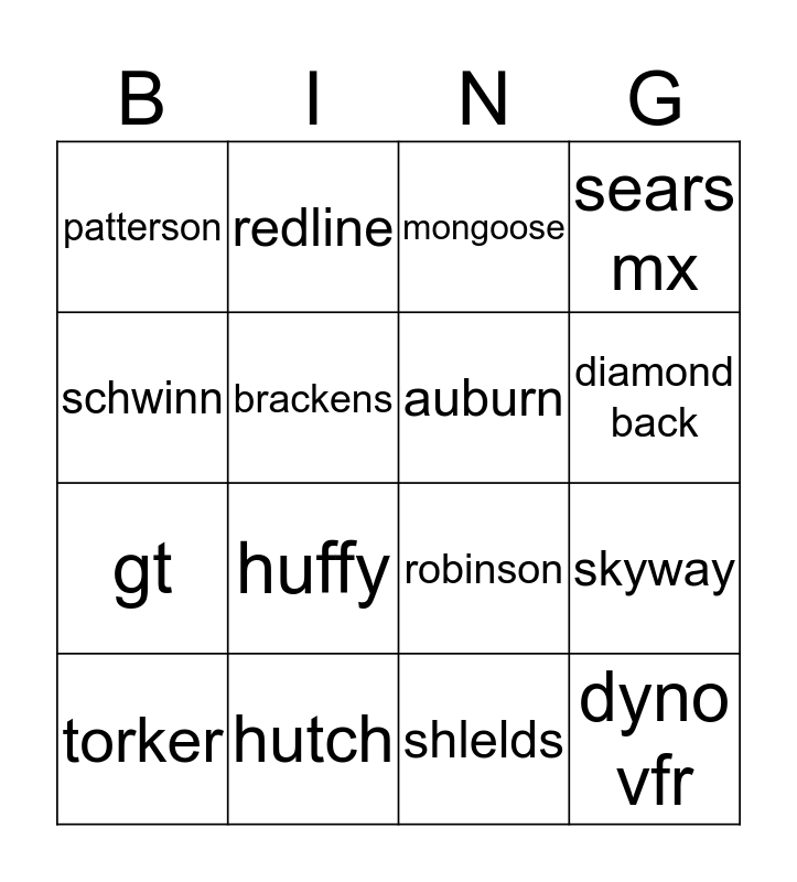 This bingo card has 20 words: skyway, haro, mongoose, dk, torker, schwinn, hutch, patterson, gt, redline, huffy, robinson, brackens, dyno vfr, auburn, roger decoster, diamond back, sears mx, shlelds and harrigan.