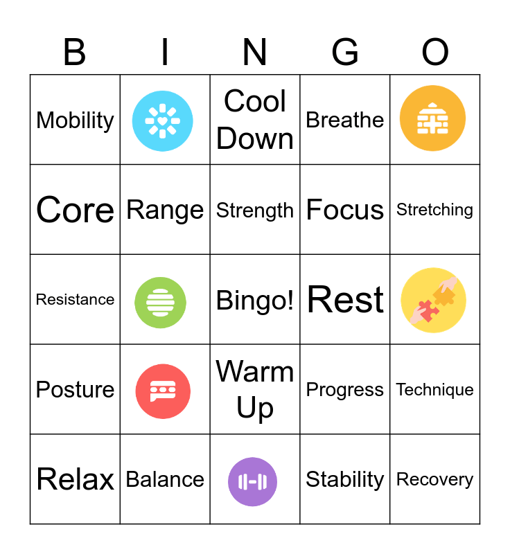 This bingo card has 6 images, a free space and 18 words: Balance, Strength, Relax, Mobility, Core, Rest, Warm Up, Focus, Resistance, Progress, Technique, Range, Stability, Cool Down, Stretching, Recovery, Posture and Breathe.