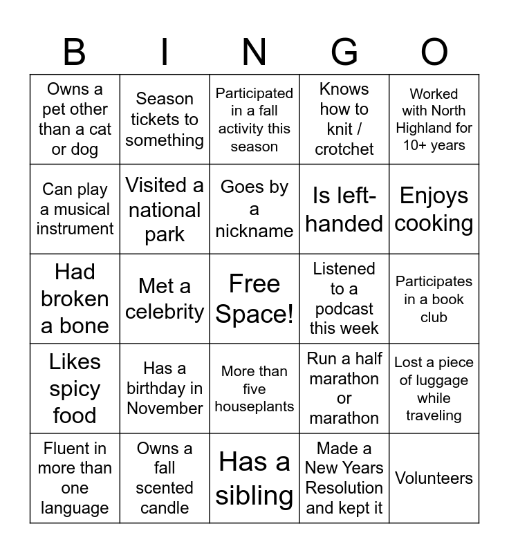 This bingo card has a free space and 24 words: Has a birthday in November, Owns a fall scented candle, Goes by a nickname, Fluent in more than one language, Worked with North Highland for 10+ years, Owns a pet other than a cat or dog, Can play a musical instrument, Season tickets to something, Listened to a podcast this week, More than five houseplants, Is left-handed, Had broken a bone, Run a half marathon or marathon, Lost a piece of luggage while traveling, Visited a national park, Made a New Years Resolution and kept it, Participates in a book club, Participated in a fall activity this season, Enjoys cooking, Met a celebrity, Volunteers, Likes spicy food, Knows how to knit / crotchet and Has a sibling.