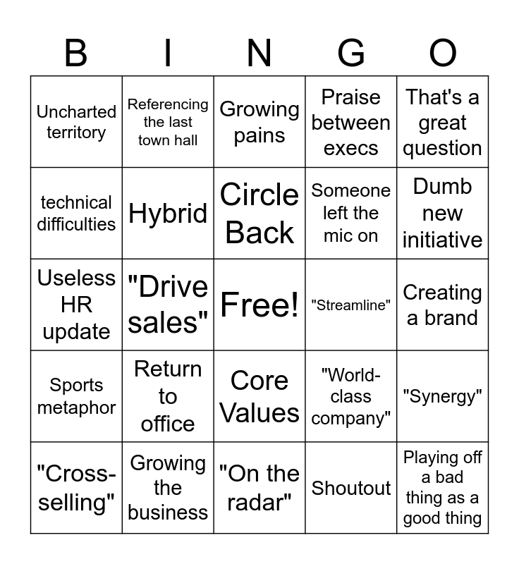 This bingo card has a free space and 26 words: Core Values, Shoutout, Circle Back, Growing the business, That's a great question, Uncharted territory, technical difficulties, Referencing the last town hall, Creating a brand, "World-class company", Someone left the mic on, Useless HR update, "Synergy", "Cross-selling", "Drive sales", "I just want to add..", Praise between execs, Sports metaphor, Growing pains, Playing off a bad thing as a good thing, Dumb new initiative, "On the radar", "Streamline", Return to office, Hybrid and Disruptor.