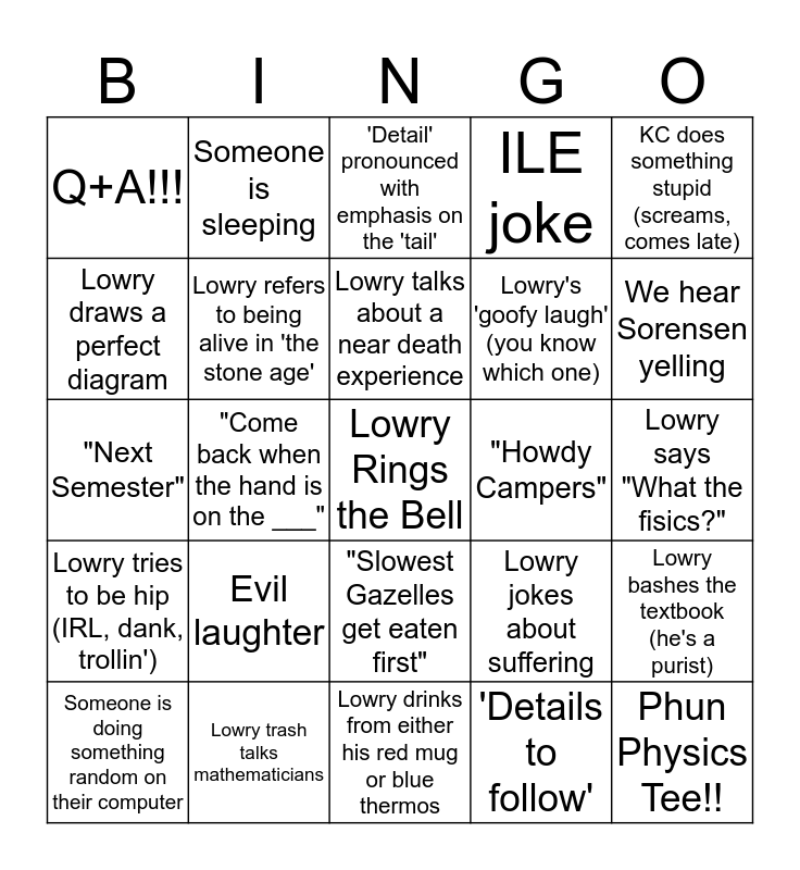 This bingo card has a free space and 24 words: Evil laughter, Lowry trash talks mathematicians, Lowry talks about a near death experience, Someone is doing something random on their computer, KC does something stupid (screams, comes late), Q+A!!!, Lowry draws a perfect diagram, Someone is sleeping, "Howdy Campers", "Slowest Gazelles get eaten first", Lowry's 'goofy laugh' (you know which one), "Next Semester", Lowry jokes about suffering, Lowry bashes the textbook (he's a purist), Lowry refers to being alive in 'the stone age', 'Details to follow', Lowry says "What the fisics?", 'Detail' pronounced with emphasis on the 'tail', We hear Sorensen yelling, "Come back when the hand is on the ___", Phun Physics Tee!!, Lowry tries to be hip (IRL, dank, trollin'), ILE joke and Lowry drinks from either his red mug or blue thermos.