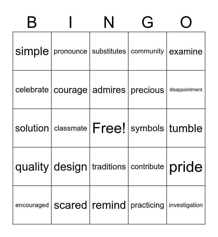 This bingo card has a free space and 24 words: design, scared, admires, encouraged, examine, simple, celebrate, pronounce, symbols, traditions, precious, solution, contribute, pride, courage, practicing, tumble, substitutes, disappointment, classmate, investigation, quality, community and remind.