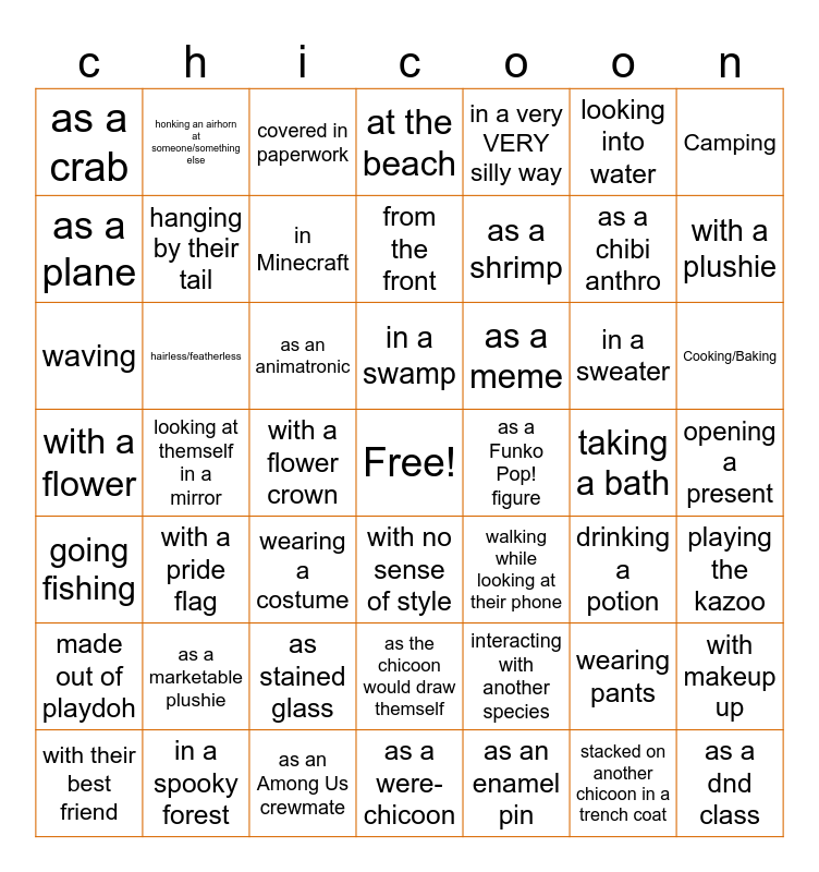 This bingo card has a free space and 100 words: flapping their headwings, interacting with another species, waving, eating a fruit, climbing a tree, asleep, carving a pumpkin, giving a hug, holding something with their hind hands, hanging from a tree, petting something, with a pet rock, as an Among Us crewmate, with a flower, being chased by a bee, drinking a potion, hanging by their tail, wearing a hat, under a blanket, as a hairless hatchling, soaking wet, sick, wearing pants, as an egg, as a marketable plushie, with a plushie, in a very VERY silly way, as a meme, as a logo, as a tarot card, as a shrimp, as a crab, with their favorite toy, with their best friend, with a flower crown, as a plane, in a sweater, reading a book, wearing a costume, as a dnd class, as an enamel pin, as stained glass, from the front, taking a bath, in Minecraft, covered in paperwork, drawing a picture, as the chicoon would draw themself, in official flame colors (retired colors allowed), looking at themself in a mirror, as a imperfect popsicle, going fishing, with a pride flag, crying, wearing a crown, scared, in formal attire, as a ghost/deceased, if the chicoon had a tattoo, at the beach, shopping, selling lemonade, as a puppet, drinking hot cocoa in a cafe, after they've had too much caffeine, in prison, doing zoomies, opening a present, with a funny expression, if they were goth, as a Funko Pop! figure, as an animatronic, in a Mcdonalds uniform, as a prehistoric chicoon, as a were-chicoon, in a spooky forest, with a frog, snail, or snake, looking into water, with makeup up, with no sense of style, in a very fluffy hoodie, as a chibi anthro, in a post-apocalypse setting, in a swamp, playing the kazoo, honking an airhorn at someone/something else, tending to a potted plant, playing leapfrog, playing with toys, hairless/featherless, walking while looking at their phone, dancing, EEEEeeeeevil, Cooking/Baking, Camping, falling down stairs/down a hill, stacked on another chicoon in a trench coat, made out of playdoh, as a child's art project and Jumping in a pile of leaves or a puddle.