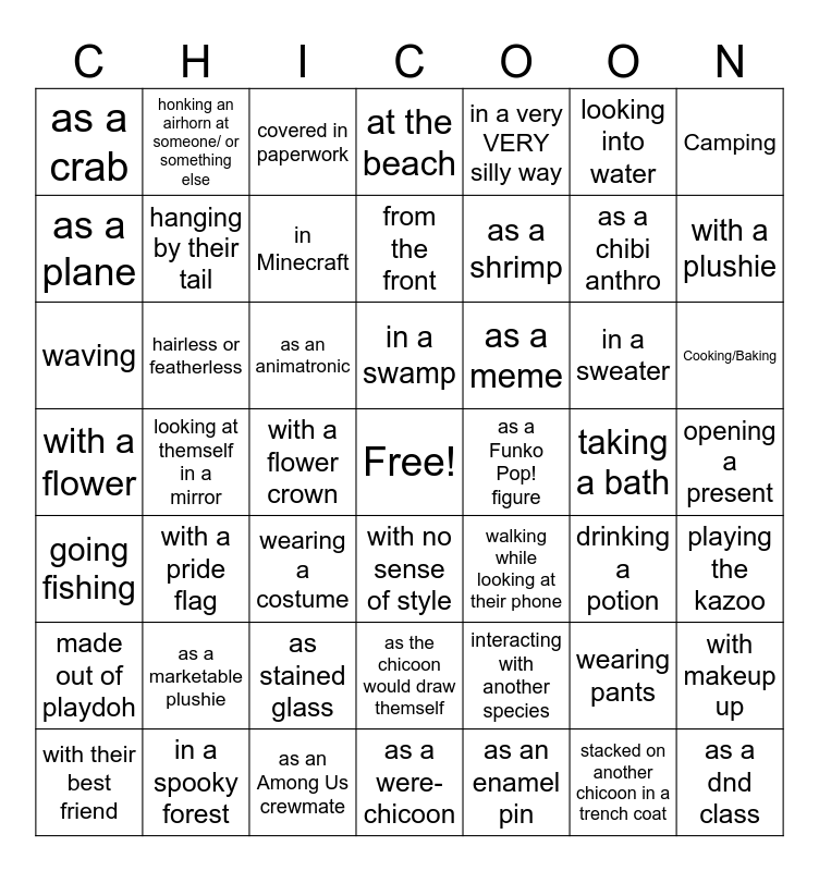 This bingo card has a free space and 100 words: flapping their headwings, interacting with another species, waving, eating a fruit, climbing a tree, asleep, carving a pumpkin, giving a hug, holding something with their hind hands, hanging from a tree, petting something, with a pet rock, as an Among Us crewmate, with a flower, being chased by a bee, drinking a potion, hanging by their tail, wearing a hat, under a blanket, as a hairless hatchling, soaking wet, sick, wearing pants, as an egg, as a marketable plushie, with a plushie, in a very VERY silly way, as a meme, as a logo, as a tarot card, as a shrimp, as a crab, with their favorite toy, with their best friend, with a flower crown, as a plane, in a sweater, reading a book, wearing a costume, as a dnd class, as an enamel pin, as stained glass, from the front, taking a bath, in Minecraft, covered in paperwork, drawing a picture, as the chicoon would draw themself, in official flame colors (retired colors allowed), looking at themself in a mirror, as a imperfect popsicle, going fishing, with a pride flag, crying, wearing a crown, scared, in formal attire, as a ghost or deceased, if the chicoon had a tattoo, at the beach, shopping, selling lemonade, as a puppet, drinking hot cocoa in a cafe, after they've had too much caffeine, in prison, doing zoomies, opening a present, with a funny expression, if they were goth, as a Funko Pop! figure, as an animatronic, in a Mcdonalds uniform, as a prehistoric chicoon, as a were-chicoon, in a spooky forest, with a frog, snail, or snake, looking into water, with makeup up, with no sense of style, in a very fluffy hoodie, as a chibi anthro, in a post-apocalypse setting, in a swamp, playing the kazoo, honking an airhorn at someone/ or something else, tending to a potted plant, playing leapfrog, playing with toys, hairless or featherless, walking while looking at their phone, dancing, EEEEeeeeevil, Cooking/Baking, Camping, falling down stairs or down a hill, stacked on another chicoon in a trench coat, made out of playdoh, as a child's art project and Jumping in a pile of leaves or a puddle.