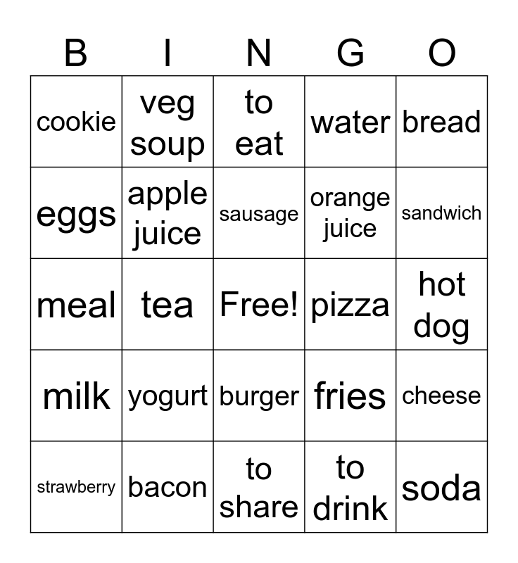 This bingo card has a free space and 24 words: yogurt, bacon, sausage, strawberry, bread, cookie, eggs, veg soup, pizza, burger, orange juice, meal, fries, cheese, apple juice, to drink, hot dog, to eat, sandwich, tea, soda, milk, water and to share.