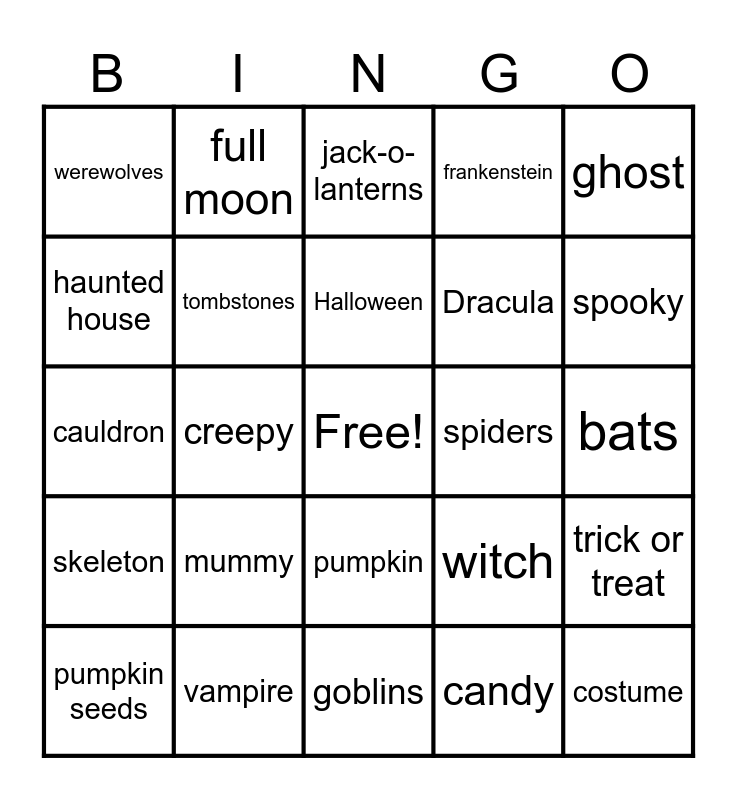 This bingo card has a free space and 24 words: mummy, vampire, Halloween, pumpkin seeds, ghost, werewolves, haunted house, full moon, spiders, pumpkin, Dracula, cauldron, witch, trick or treat, tombstones, candy, bats, jack-o-lanterns, spooky, creepy, costume, skeleton, frankenstein and goblins.