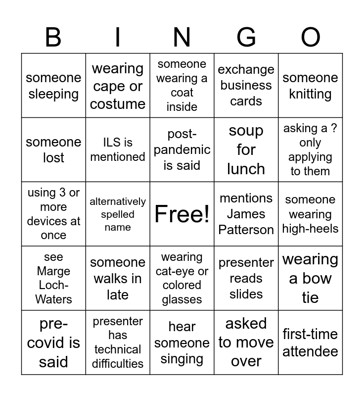 This bingo card has a free space and 24 words: someone walks in late, presenter has technical difficulties, post-pandemic is said, pre-covid is said, someone knitting, someone sleeping, someone lost, wearing cape or costume, mentions James Patterson, wearing cat-eye or colored glasses, soup for lunch, using 3 or more devices at once, presenter reads slides, wearing a bow tie, ILS is mentioned, asked to move over, someone wearing high-heels, someone wearing a coat inside, asking a ? only applying to them, alternatively spelled name, first-time attendee, see Marge Loch-Waters, exchange business cards and hear someone singing.