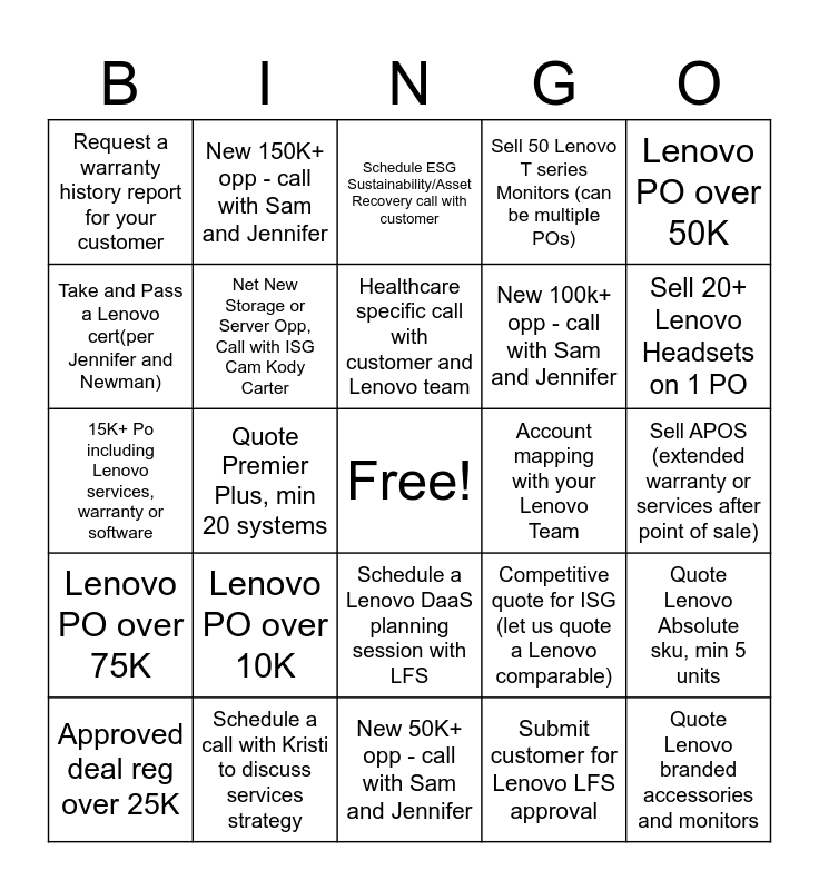 This bingo card has a free space and 24 words: Lenovo PO over 10K, Schedule a call with Kristi to discuss services strategy, Healthcare specific call with customer and Lenovo team, Approved deal reg over 25K, Lenovo PO over 50K, Request a warranty history report for your customer, Take and Pass a Lenovo cert(per Jennifer and Newman), New 150K+ opp - call with Sam and Jennifer, Account mapping with your Lenovo Team, Schedule a Lenovo DaaS planning session with LFS, New 100k+ opp - call with Sam and Jennifer, 15K+ Po including Lenovo services, warranty or software, Competitive quote for ISG (let us quote a Lenovo comparable), Quote Lenovo Absolute sku, min 5 units, Net New Storage or Server Opp, Call with ISG Cam Kody Carter, Submit customer for Lenovo LFS approval, Sell APOS (extended warranty or services after point of sale), Schedule ESG Sustainability/Asset Recovery call with customer, Sell 20+ Lenovo Headsets on 1 PO, Quote Premier Plus, min 20 systems, Quote Lenovo branded accessories and monitors, Lenovo PO over 75K, Sell 50 Lenovo T series Monitors (can be multiple POs) and New 50K+ opp - call with Sam and Jennifer.