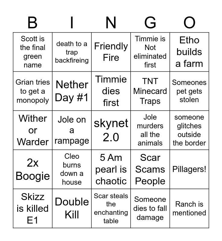 This bingo card has 25 words: Cleo burns down a house, Scar steals the enchanting table, Timmie dies first, Skizz is killed E1, Etho builds a farm, Scott is the final green name, Grian tries to get a monopoly, death to a trap backfireing, Jole murders all the animals, 5 Am pearl is chaotic, TNT Minecard Traps, Wither or Warder, Scar Scams People, Pillagers!, Nether Day #1, Ranch is mentioned, someone glitches outside the border, Friendly Fire, Someones pet gets stolen, Jole on a rampage, skynet 2.0, Double Kill, 2x Boogie, Timmie is Not eliminated first and Someone dies to fall damage.