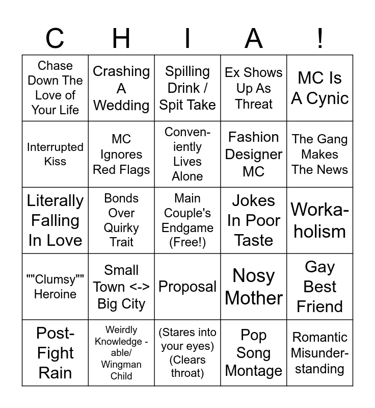This bingo card has a free space and 28 words: Gay Best Friend, Seattle Setting, Fashion Designer MC, Pop Song Montage, Interrupted Kiss, Spilling Drink / Spit Take, Crashing A Wedding, ""Clumsy"" Heroine, Jokes In Poor Taste, Post-Fight Rain, Literally Falling In Love, Ex Shows Up As Threat, Weirdly Knowledge -able/ Wingman Child, (Stares into your eyes) (Clears throat), The Gang Makes The News, Mistaken/ Hidden Identity, Small Town <-> Big City, MC Ignores Red Flags, Conven- iently Lives Alone, Proposal, Chase Down The Love of Your Life, Humiliate The Love Rival, Romantic Misunder-standing, Bonds Over Quirky Trait, Worka-holism, Nosy Mother, MC Is A Cynic and Struggles W/ Heels.