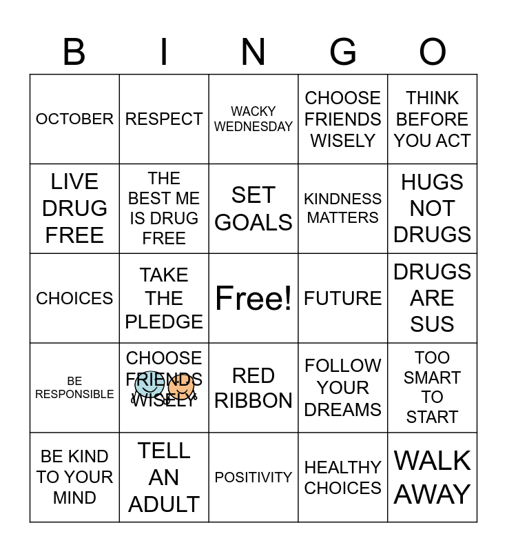 This bingo card has 1 images, a free space and 25 words: CHOOSE FRIENDS WISELY, POSITIVITY, SET GOALS, BE KIND TO YOUR MIND, THINK BEFORE YOU ACT, OCTOBER, LIVE DRUG FREE, RESPECT, FUTURE, RED RIBBON, KINDNESS MATTERS, CHOICES, FOLLOW YOUR DREAMS, TOO SMART TO START, THE BEST ME IS DRUG FREE, JUST SAY NO, DRUGS ARE SUS, WACKY WEDNESDAY, HUGS NOT DRUGS, TAKE THE PLEDGE, WALK AWAY, TELL AN ADULT, BE RESPONSIBLE, CHOOSE FRIENDS WISELY and HEALTHY CHOICES.