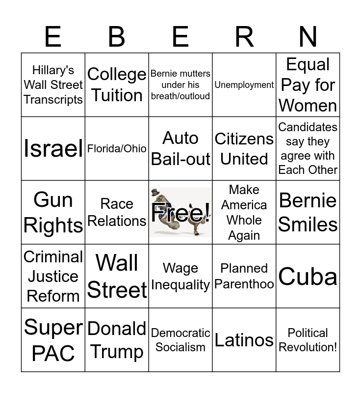 This bingo card has a free space and 24 words: Wall Street, Donald Trump, Auto Bail-out, Super PAC, Equal Pay for Women, Hillary's Wall Street Transcripts, Israel, College Tuition, Make America Whole Again, Wage Inequality, Citizens United, Gun Rights, Planned Parenthoo, Cuba, Florida/Ohio, Latinos, Bernie Smiles, Bernie mutters under his breath/outloud, Candidates say they agree with Each Other, Race Relations, Political Revolution!, Criminal Justice Reform, Unemployment and Democratic Socialism.