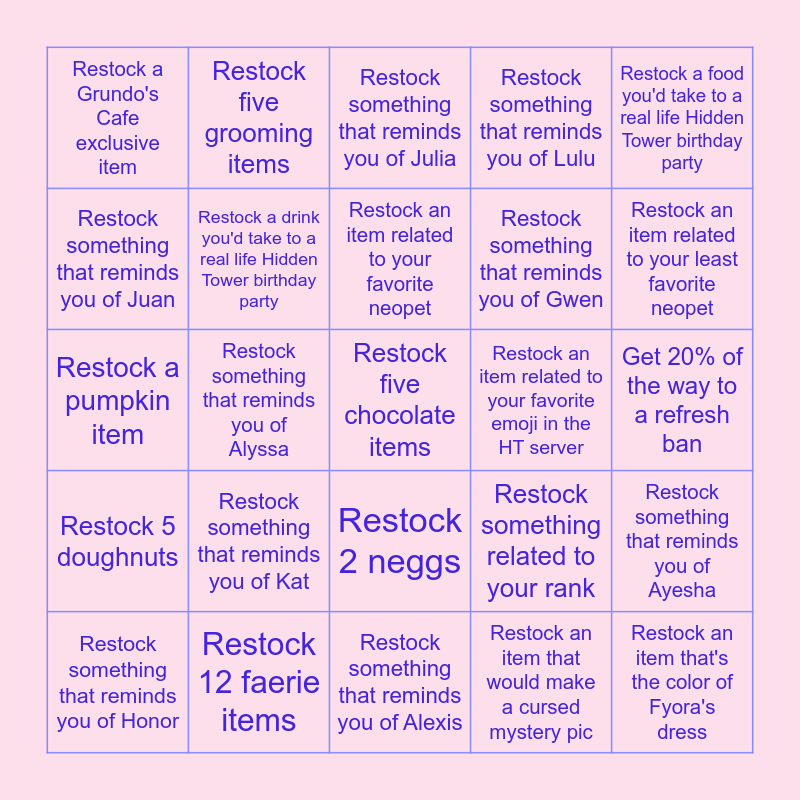 This bingo card has 25 words: Restock something that reminds you of Kat, Restock something that reminds you of Alexis, Restock an item related to your favorite neopet, Restock something that reminds you of Honor, Restock a food you'd take to a real life Hidden Tower birthday party, Restock a Grundo's Cafe exclusive item, Restock something that reminds you of Juan, Restock five grooming items, Restock an item related to your favorite emoji in the HT server, Restock 2 neggs, Restock something that reminds you of Gwen, Restock a pumpkin item, Restock something related to your rank, Restock something that reminds you of Ayesha, Restock a drink you'd take to a real life Hidden Tower birthday party, Restock an item that's the color of Fyora's dress, Get 20% of the way to a refresh ban, Restock something that reminds you of Julia, Restock an item related to your least favorite neopet, Restock something that reminds you of Alyssa, Restock five chocolate items, Restock 12 faerie items, Restock 5 doughnuts, Restock something that reminds you of Lulu and Restock an item that would make a cursed mystery pic.