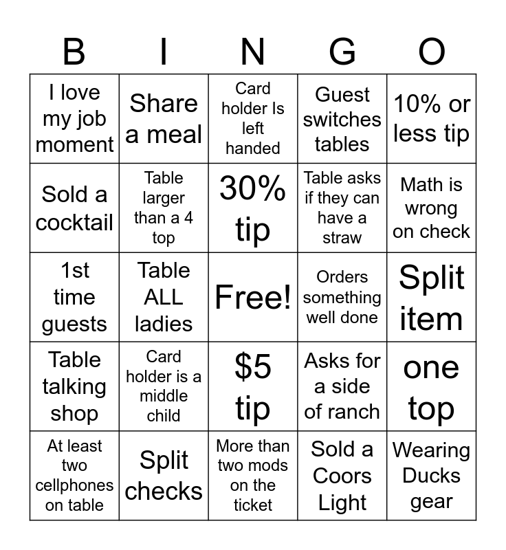 This bingo card has a free space and 24 words: Card holder is a middle child, Split checks, 30% tip, At least two cellphones on table, 10% or less tip, I love my job moment, Sold a cocktail, Share a meal, Orders something well done, $5 tip, Table asks if they can have a straw, 1st time guests, Asks for a side of ranch, one top, Table larger than a 4 top, Sold a Coors Light, Split item, Card holder Is left handed, Math is wrong on check, Table ALL ladies, Wearing Ducks gear, Table talking shop, Guest switches tables and More than two mods on the ticket.