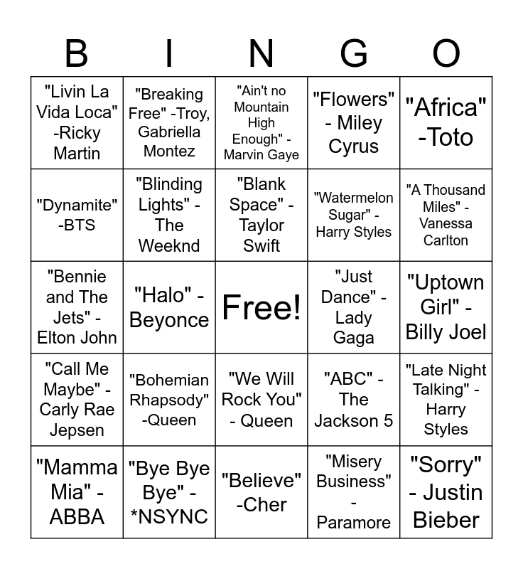 This bingo card has a free space and 60 words: "You Belong With Me" -Taylor Swift, "Bye Bye Bye" -*NSYNC, "As It Was" -Harry Styles, "Call Me Maybe" -Carly Rae Jepsen, "Misery Business" -Paramore, "We Found Love" -Rihanna, "Blinding Lights" -The Weeknd, "Cold Heart-Remix" -Elton John, Dua Lipa, "Watermelon Sugar" -Harry Styles, "No One" -Alicia Keys, "Flowers" - Miley Cyrus, "Shut Up and Dance" -Walk The Moon, "Dynamite" -BTS, "Fireworks" - Katy Perry, "Fireflies" -Owl City, "Livin La Vida Loca" -Ricky Martin, "Sorry" - Justin Bieber, "Africa" -Toto, "Hotline Bling" -Drake, "Blank Space" -Taylor Swift, "Just Dance" -Lady Gaga, "Ain't no Mountain High Enough" -Marvin Gaye, "Mamma Mia" - ABBA, "Late Night Talking" -Harry Styles, "Come On Eileen" -Dexys Midnight Runners, "I Wanna Dance with Somebody" -Whitney Houson, "Love Story" -Taylor Swift, "Baby" -Justin Bieber, Ludacris, "A Thousand Miles" -Vanessa Carlton, "Party in the USA" - Miley Cyrus, "What Makes You Beautiful" -One Direction, "I Gotta Felling" -Black Eyed Peas, "Umbrella" -Rihanna, Jay-Z, "We Found Love" - Rihanna, "Breaking Free" -Troy, Gabriella Montez, "Mean" -Taylor Swift, "Timber" -Pitbull, Kesha, "Halo" -Beyonce, "Tik Tok" -Kesha, "Bennie and The Jets" -Elton John, "Wonderwall" -Oasis, "Bohemian Rhapsody" -Queen, "Uptown Girl" -Billy Joel, "Build Me Up Buttercup" -The Foundations, "ABC" -The Jackson 5, "Take on Me" - a-ha, "September" -Earth, Wind & Fire, "Go Your Own Way" -Fleetwood Mac, "Dreams" -Fleetwood Mac, "We Will Rock You" - Queen, "Believe" -Cher, "I Knew You Were Trouble" -Taylor Swift, "One Time" -Justin Bieber, "Since U Been Gone" -Kelly Clarkson, "I Want It That Way" - Backstreet Boys, "Sweet Child O' Mine" - Guns N' Roses, "Running Up That Hill" -Kate Bush, "Save Your Tears" -The Weeknd, Ariana Grande, "Levitating" -Dua Lipa and "No Tears Left To Cry" -Ariana Grande.