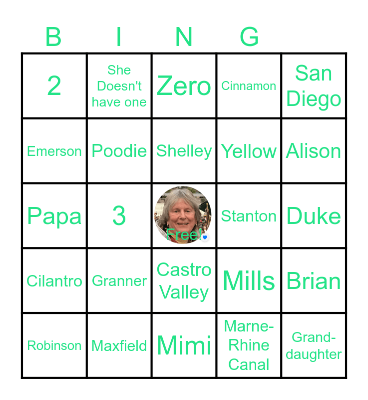 This bingo card has a free space and 24 words: Granner, Maxfield, Shelley, Robinson, San Diego, 2, Emerson, She Doesn't have one, Stanton, Castro Valley, Yellow, Papa, Mills, Brian, Poodie, Marne-Rhine Canal, Duke, Zero, Alison, 3, Grand-daughter, Cilantro, Cinnamon and Mimi.