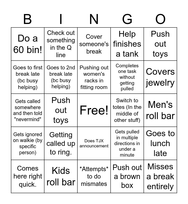 This bingo card has a free space and 24 words: Comes here right quick., Getting called up to ring., Pushing out women's racks in fitting room, Push out a brown box, Push out toys, Do a 60 bin!, Check out something in the Q line, Cover someone's break, Switch to totes (In the middle of other stuff), Men's roll bar, Gets called somewhere and then told "nevermind", Goes to 2nd break late (bc busy helping), Gets pulled in multiple directions in under a minute, Goes to lunch late, Goes to first break late (bc busy helping), Kids roll bar, *Attempts* to do mismates, Help finishes a tank, Covers jewelry, Gets ignored on walkie (by specific person), Push out toys, Does TJX announcement, Completes one task without getting pulled and Misses a break entirely.
