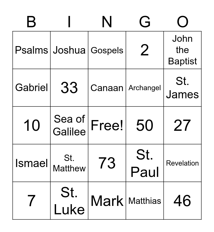 This bingo card has a free space and 36 words: Malachi, Bethlehem, St. John, 33, St. Paul, Ismael, Canaan, God is with us, John the Baptist, Mary Magdalene, Sea of Galilee, 2, St. Elizabeth, 50, St. James, Psalms, Cain, St. Matthew, 46, Gospels, 27, Revelation, St. Luke, 7, Mark, Joshua, 10, 12, Archangel, Gabriel, David, 4, Matthias, 73, River Jordan and Seth.